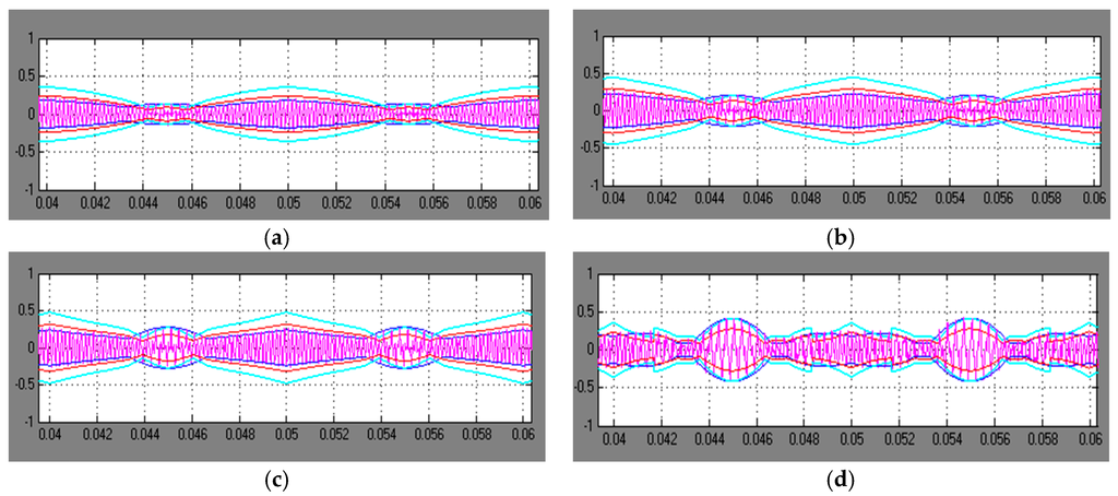 An example of the system behavior is given in Figure 23, considering the case of DPWM3 with m = 1/6: Pole-to-neutral voltage (green trace), instantaneous current (red trace), fundamental current component (grey trace), and current ripple (blue trace), for one fundamental period (20 ms).