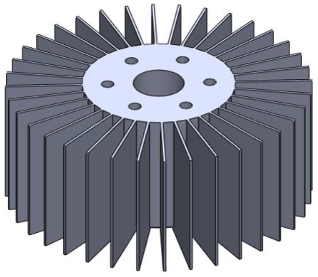 Many studies have focused on natural convective heat sinks, as reviewed in Martynenko and Khramtsov [9] and in Raithby and Hollands [10]. In particular, many previous researchers investigated natural convection from cylindrical heat sinks, which are cylindrical bodies with fins attached. These studies are motivated by the fact that the heat dissipation from the cylinder can be increased by using the fins. Sparrow and Bahrami investigated heat transfer from square vertical fins attached to a horizontal tube by using the naphthalene sublimation technique [11]. Chen and Chou also conducted an experimental study of horizontal cylinders with square vertical fins [12]. Yildiz and Yüncü suggested a Nusselt number correlation for annular fin arrays mounted on a horizontal cylinder from their experimental data [13]. Hahne and Zhu also suggested a Nusselt number correlation for horizontal cylinders with annular fins from measured heat transfer coefficients [14]. Recently, vertical cylinders with vertically oriented radial plate fins, as shown in Figure 1, are widely used for cooling LED lighting. For natural convection from these cylinders with radial plate fins, an empirical correlation for estimating the Nusselt number was proposed by our group [15].