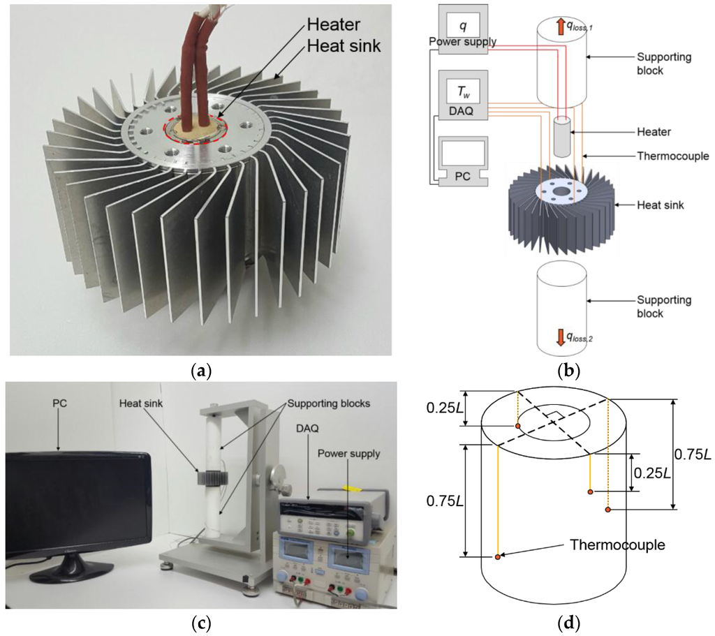 The heat sinks were assembled by interference fitting of the fins and base. Then, a cartridge heater was inserted into the inner hole of the base (Figure 3a). A thermal interface material (TC 5080; Dow Corning: Auburn, MI, USA) was used to minimize the contact thermal resistance between the heat sink base and the heater. The supporting cylindrical blocks, the length of which was 200 mm, were made of Teflon to minimize the heat loss from the top and bottom sides of the base (Figure 3b,c). Power was supplied to the heater from a power supply (E3633A; Agilent Technologies: Santa Clara, CA, USA) in the range 2–45 W. To calculate the actual heat transfer rate to the heat sink, the heat loss through the supporting blocks (qloss,1 + qloss,2 in Figure 3b) was measured and subtracted from the electric power supplied to the heater (Appendix A). To measure the base temperature, four T-type thermocouples were circumferentially attached to the cylinder (Figure 3d) A data acquisition unit (34970A DAQ; Agilent Technology) was used to acquire the signals from the thermocouples and convert them into temperature data. The temperatures were measured until the change in the temperature was smaller than ±0.1 °C in a 2 min period. The experiments were performed in an isolated and quiescent room.
