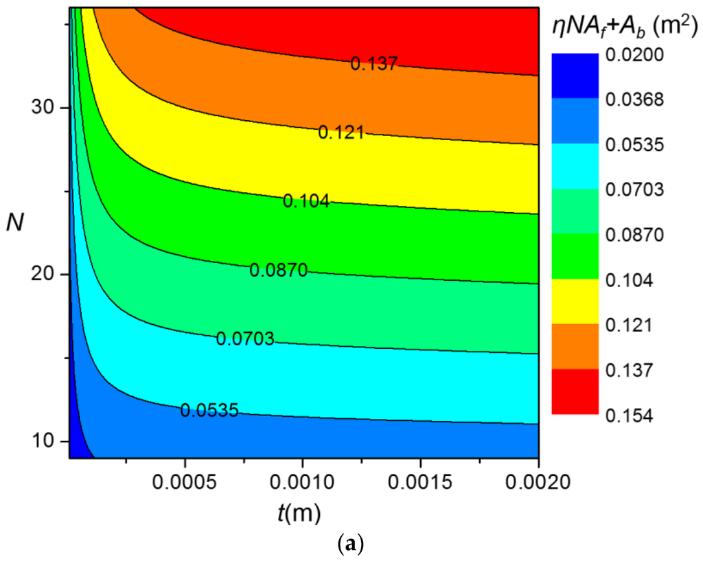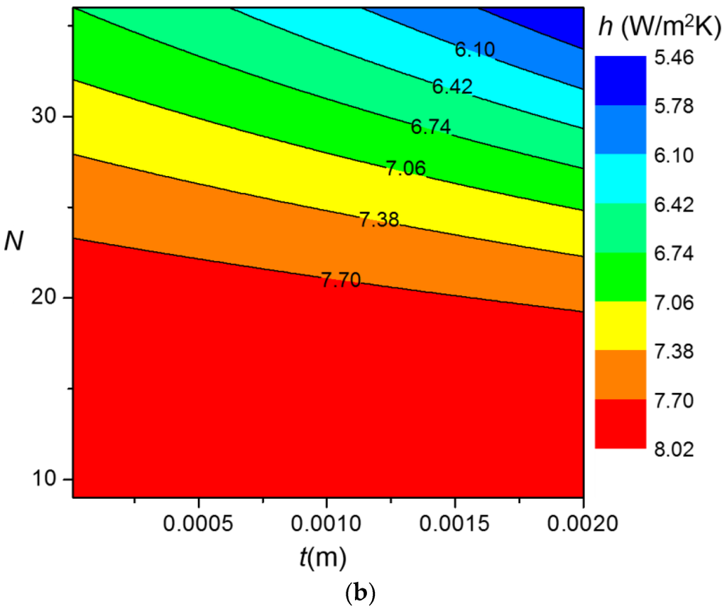 Contour maps of (a) effective surface area and (b) heat transfer coefficient for various fin numbers and fin thicknesses (H = 30 mm, D = 60 mm, L = 50 mm, α = 60°, Tw − Tamb = 50 °C, kf = 0.026 W/m K, ks = 220 W/m K, νf = 1.6 × 10−5 m2/s, αf = 2.23 × 10−5 m2/s, βf = 0.0033/K).