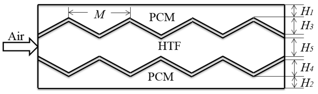 Physical configuration of the zigzag configuration. H: height; M: tooth length; PCM: phase-change-material; and HTF: heat transfer fluid.
