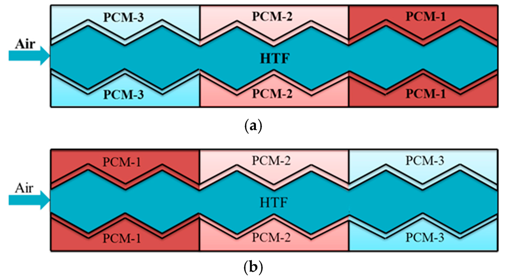 Arrangement of multiple phase-change-materials (m-PCMs) in (a) reverse and (b) forward directions.