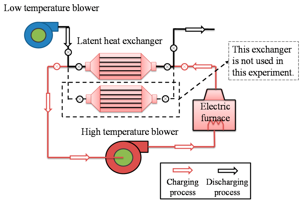 Experimental work was carried out to verify the model. Figure 3 shows a schematic diagram of the experimental system, which consisted mainly of an electric heating furnace, a high temperature blower, and two phase change heat exchangers. In the charge process, air was heated to a preset temperature by the electric heating furnace and driven to circulate in the loop by a high temperature blower. In the charge step, the heated air flowed through the phase changer heat exchangers where heat was transferred to and stored within the phase change material. When fully charged (judged from temperature measurements of the outlet air temperature), the electric furnace and the high temperature blower were switched off to end the charging step. In the discharge step, the ambient air blower was switched on to deliver a preset rate of air flow to the charged phase change heat exchanger. Air was used as the HTF because of the high melting points of the phase change materials considered in this work. The two heat exchangers could be charged at the same time. Through the use of a combination of valves, it was also possible to charge one of the heat exchangers while the other was discharged. In this work, only one phase change heat exchangers was used, and the charge-discharge processes occurred cyclically.