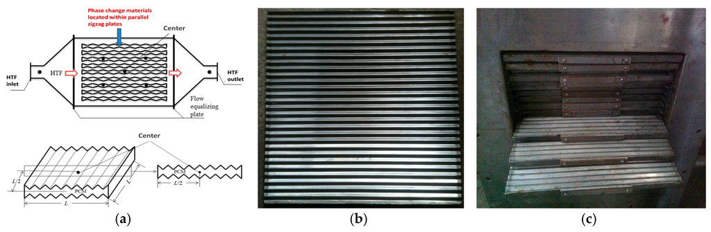 Various temperature, flow and pressure transducers were installed and linked to a data acquisition unit. The temperature of the phase change materials was measured using K-type thermocouples which have the measurement range of 273.15–1273.15 K and error range of ±0.2% and the thermocouple arrangement is shown in Figure 4a. The surface of the zigzag plate is shown in Figure 4b. Each phase change heat exchanger contained 23 pairs of parallel zigzag plates with the phase change materials sealed between each pair of the zigzag plates, and the internal structure of the heat exchanger are shown in Figure 4c. The flow of the HTF was through channels of adjacent pairs of the zigzag plates.