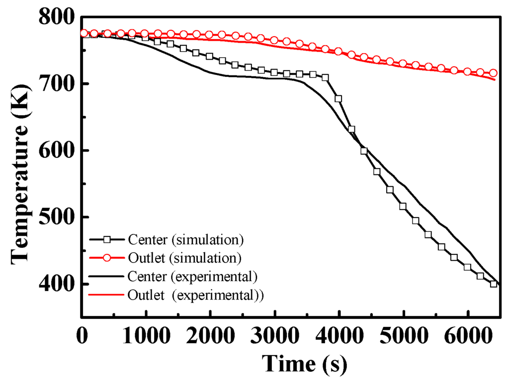 Figure 5 compares the measured and calculated time evolutions of the temperature at the outlet and the centre of PCM (as indicated in Figure 4a). It can be seen that reasonably good agreement has been achieved, thus establishing confidence in the model. The deviation of thermocouple 1 is likely associated with the existence of pores in the PCM because the material was loaded into the plate heat exchangers in compacted powder form. Other reasons may include the temperature dependence of the PCM properties, an uneven distribution of the HTF flow across all of the plates, which were not considered in the modelling, or the location of the thermocouple.