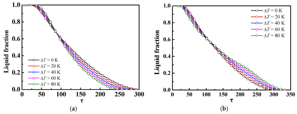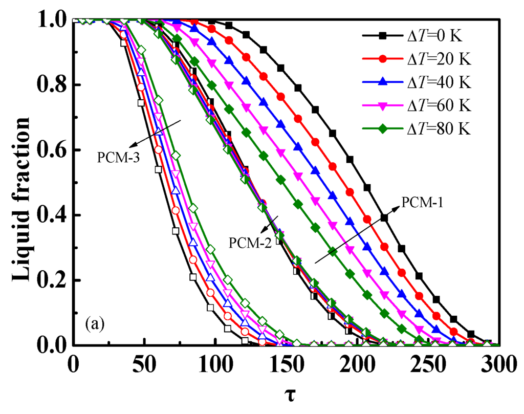 As can be seen from Figure 8, there is little difference in the liquid fraction curves of PCM-2 for different values of ΔT. Explanations for this observation could be as follows: the first is that the heat transfer in m-PCMs is controlled by the thermal conductivity in the solidification process; the second one is that there is no relationship between the phase change temperature of PCM-2 and the value of ΔT.