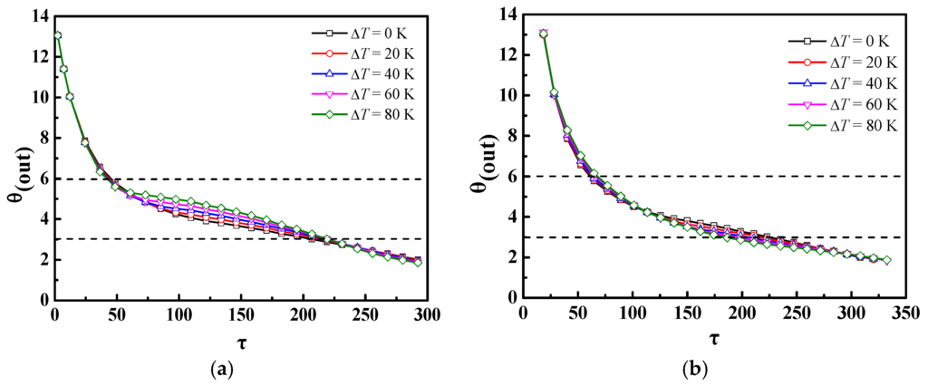 As shown in Figure 7a, the dimensionless outlet temperatures are close to each other and decrease quickly in the initial period (τ < 50), then separate at a constant value in the middle period (50 < τ < 200), and finally coincide with each other in the discharging process. The constant value of θ(out) increases with ΔT because the PCM-1 is in the downward arrangement and the TPCM-1 increases with ΔT value. As shown in Figure 7b, when the m-PCMs are in the reversed arrangement, the values of θ(out) are close to each other, except in the middle period (125 < τ < 225). However, this separation in the forward arrangement is much smaller than that in the reversed arrangement. In addition, the value of θ(out) in the middle period decreases with the ΔT because the PCM-3 is in the downward arrangement and the TPCM-3 increases with ΔT. From Figure 7, one can find that the value of θ(out) in the reversed arrangement is higher than that in the forward arrangement. Comparing the value of θ(out) between the two imaginary lines from Figure 7, the θ(out) value in Figure 7a is bigger than in Figure 7b.