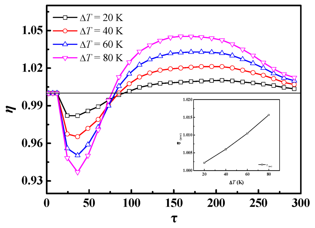 where Q refers to the total amount of thermal energy stored and η is the ratio of the total heat stored in the m-PCMs (ΔT ≠ 0 K) to that in a single PCM (ΔT = 0 K). η can therefore be regarded as the m-PCMs’ effectiveness. Figure 9 shows the change of η as a function of dimensionless time for different ΔT. For a given ΔT, η decreases first with time, reaches a minimum τ = τmin, then increases with time, peaks at τ = τmax, and finally decreases to 1. Both the τmin and τmax are functions of ΔT. The τmin lies in the range of 25–35, whereas the τmax is between 160 and 200. Dimensionless time durations with ΔT larger than 1 are far longer than that with ΔT smaller than 1. The m-PCMs’ effectiveness at τmin and τmax are also a function of ΔT; a large ΔT gives a lower η at the τmin but a higher η at the τmax. For a given ΔT, η is higher than 1 for most of the discharging process, leading to an overall process intensification through the use of m-PCMs. As shown in the inset figure of Figure 9, the average η (η(ave)) over all τ increases with the value of ΔT, which means a higher ΔT gives a larger extent of overall process enhancement in the case of the reversed arrangement.