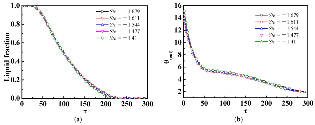 (a) Liquid fractions of the m-PCMs and (b) dimensionless outlet temperature as a function of dimensionless time at different Ste numbers.