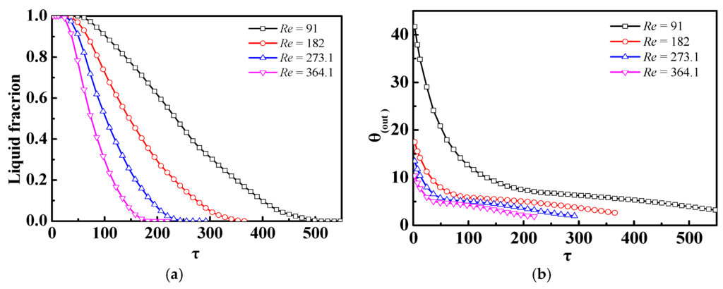 (a) Liquid fractions of the m-PCMs and (b) dimensionless outlet temperature as a function of dimensionless time at different Re numbers.