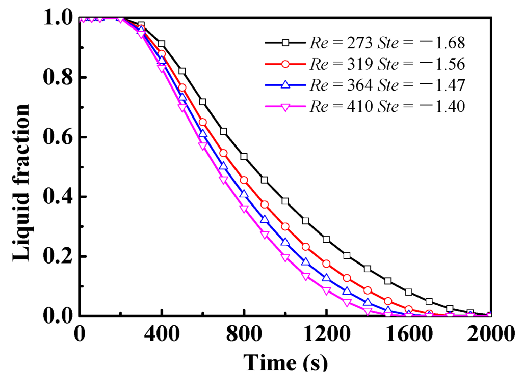 Time evolution of liquid fractions at different inlet velocity (Re)/inlet temperature (Ste) (Re/Ste) numbers under the given inlet power condition.