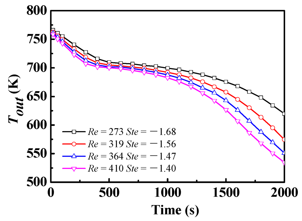 Figure 13 shows the time evolution of the outlet temperature at different Re/Ste numbers under the given inlet power condition. One can see that the outlet temperature decreases quickly first, then reaches a certain value, and finally decreases relatively fast again. This is because the temperature of the m-PCMs is higher than the phase change temperature at the initial period and the heat released to the HTF is in a sensible form. As the discharge progresses, the m-PCMs begin to freeze and release heat mainly in latent form; over time, the heat released to the HTF is mainly in a sensible form in the final stage because most of the latent heat has been released to the HTF already.