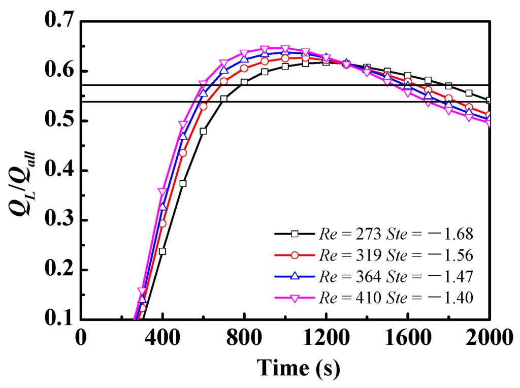 Figure 14 shows that rises abruptly after an initial stage and reaches a peak which increases with the Re number; then they decrease slowly and intersect with each other in the latter half of the discharging process. The difference among the values of is small (0.54–0.57) at the moment that the m-PCMs are fully frozen. As expressed in Equation (20), the value of equals 0.271, 0.391, 0.405 and 0.415 when the Re number equals 273, 319, 364 and 410, respectively, which leads to an intersection in the latter half of the discharging process.