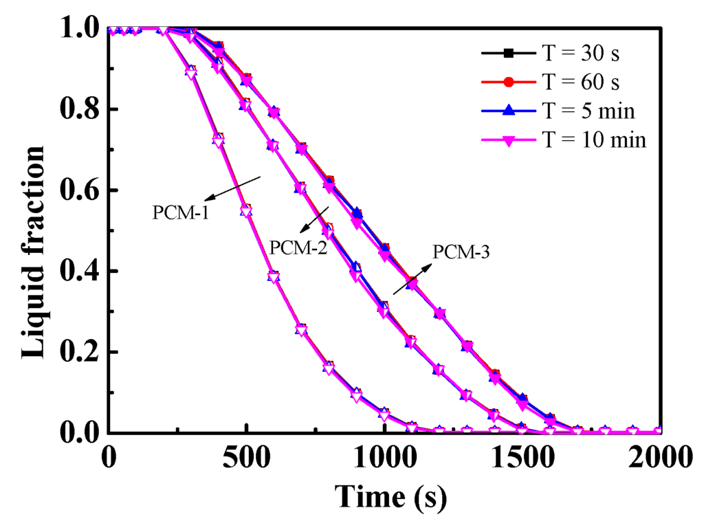 where T is the period of the inlet temperature. B and C are the amplitude and a constant value, which equal 1.5 and 7.5, respectively. Aa is the cross-sectional area of inlet. To find the impact of a period on the solidification of m-PCMs, two small periods (T = 30 s/60 s) and two large periods (T = 5 min/10 min) are chosen in this work. As one can see from Figure 15, the liquid fraction curves of PCM-1, PCM-2 and PCM-3 almost coincide with each other, which means that the value of the period (30 s < T < 10 min) has little or no effect on the solidification of m-PCMs in the zigzag plate unit.