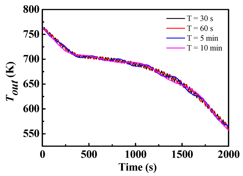 Figure 16 shows the time evolution of the outlet temperatures at different T under the given inlet power condition. The amplitude of the inlet temperature is 80 K, but the amplitude of the outlet temperature is much smaller (<10 K) at different values of the period, which indicates that the zigzag plate with m-PCMs has a good impact on the temperature shock as “filter action” in the communication field.