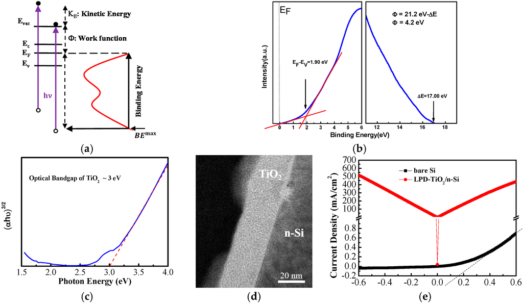 (a) Schematic of work function of TiO2 determined through ultraviolet (UV) photoemission spectroscopy (UPS) spectroscopy; (b) UPS spectrum of liquid phase deposition (LPD)-TiO2; (c) optical bandgap of TiO2 layer; (d) image of TiO2/Si interface taken through transmission electron microscopy (TEM); and (e) I-V characteristics of Al/LPD-TiO2/Si diode.