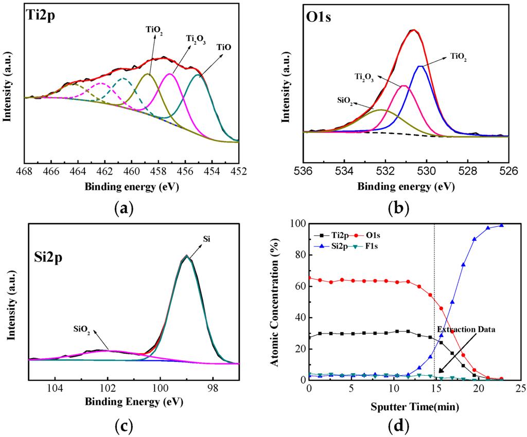 (a) Ti 2p; (b) O 1s; (c) Si 2p core level atomic structures for LPD-TiO2 obtained through X-ray photoelectron spectroscopy (XPS); and (d) depth profiles of these signals.