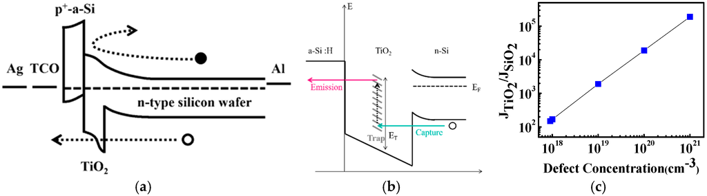 When holes become close to TiO2, they are captured by traps (gap states) and then emitted to a-Si:H by the internal field. Therefore, the capture rate (Rci) and emission rate (Rei)) are dominant factors influencing the tunneling current. The current density can be expressed as the sum of the capture and emission rates Ri in each trap multiplied by the trap cross section , as shown in Equation (3).