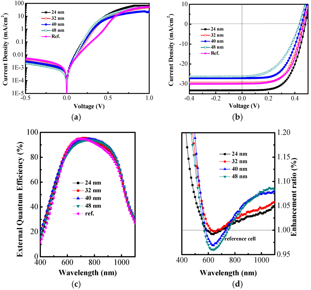 The dark and photocurrent-voltage characteristics are illustrated in Figure 4a,b, respectively. All solar cells with a TiO2 layer ranging from 24 nm to 48 nm in thickness exhibit favorable junction behavior. The rectifier ratio calculated at 0.5 V is approximately 7500 for a device with 24-nm-thick TiO2. Other devices have similar values. The ideal factors for solar cells with 24-, 32-, 40-, and 48-nm-thick TiO2 layers are 1.63, 1.75, 1.71, and 1.45, respectively. Such moderate ideal factors indicate that carrier recombination is not high at the TiO2/Si interface. However, if the TiO2 layer is absent in the heterojunction solar cell, the reverse saturation current clearly increases. The reverse saturation current density, J0, for a reference device (without TiO2) is 7.12 × 10−7 A/cm2, and it is 3.54 × 10−7 A/cm2 for a device with 24-nm-thick TiO2. In addition, the reference device exhibits a relatively high ideal factor (>2) at a forward voltage. These findings indicate that TiO2 can properly passivate the interface between a-Si:H and Si as well as further improve the electrical contact behavior between them.