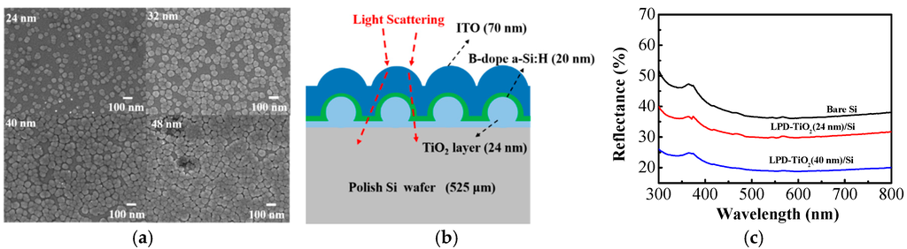 Figure 5a depicts plan-view SEM images of the LPD-grown TiO2 with different thicknesses. Many randomly arranged circular protrusions in a moth-eye-like structure were found over the LPD-TiO2 surface. The density of these structures increases as the TiO2 thickness increases. The diameter for each structure is approximately 100 nm. This dimension is close to the quarter wavelength of visible light in TiO2. Therefore, the interaction of incident light and LPD-grown TiO2 can be expressed by Mie scattering [30,31,32]. In the mechanism of Mie scattering, the percentage of back scattering is lower than that of Rayleigh scattering. Therefore, most of the incident light can be coupled into Si with high deflection. The deflected light can be reflected back and forth many times inside Si, increasing the absorbance of the incident light. This scattering mechanism is illustrated in Figure 5b. The reflectance of the LPD-grown TiO2 on Si at 300–800 nm is shown in Figure 5c. In the figure, thick TiO2 exhibits lower reflectance than that of thin TiO2, indicating that the incident light is more intense for the thick TiO2. However, the solar cell with the thick TiO2 exhibits a lower Jsc than that of the solar cell with the thin TiO2. Therefore, as the TiO2 thickness increases, hole transport through TiO2 to the anode becomes less easy, causing the current density to decrease. Consequently, the improved performance of the device is due to the enhanced hole transport rather than increased light trapping.