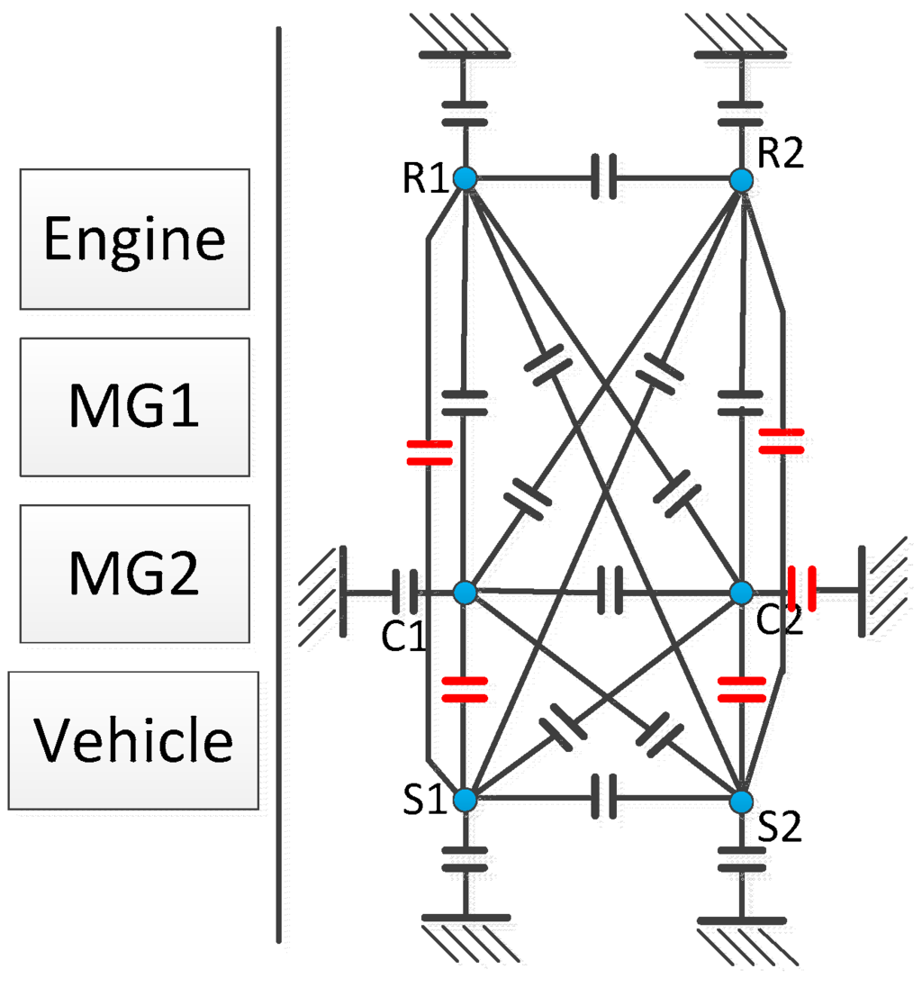 where calculates the number of k-combinations from a given set of n elements, and Np is the number of PGs. The first term represents the number of clutches that connect any two nodes; the second term reflects the number of clutches that can ground PG nodes; the third term stands for the redundant clutches because locking any two of the three nodes in a PG produce identical dynamics. It should be noted that the output node connected with vehicle should not be grounded, which results in the last term. Therefore, 16 clutch locations are available when composing a new design with a double-PG powertrain system, as shown in Figure 1, and the redundant clutches are marked in red.
