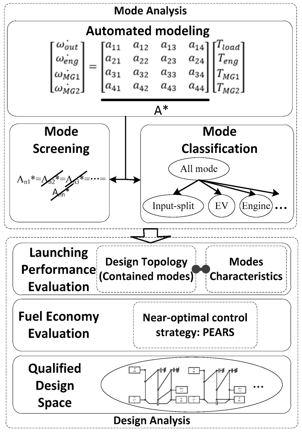 The exhaustive search approach has been used to explore all possible designs for optimal fuel economy and launching performance [27]. The flowchart of the exhaustive search is shown in Figure 2. With the automated modeling technology, the characteristic matrix A* which fully describes the dynamics of the system could be generated rapidly. Then, the modes that share the same characteristic matrix (i.e., identical modes) are identified, and only one of them is retained for subsequent analysis. In addition, all modes are classified into 14 different mode types based on their characteristics and functionalities. The criteria for the mode classification was proposed in [27]. After the mode analysis, winning designs are selected through a launching performance and fuel economy evaluation. Finally, a small pool of winning designs is obtained.