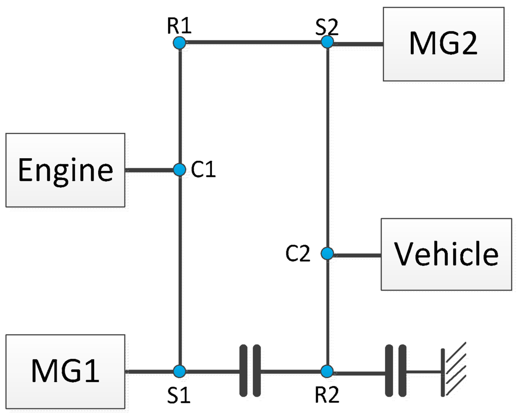 The optimal topology studies started from single-PG HEVs [4]. Different modeling methods, i.e., automatic modeling [23,24] and bond graphs [25], have been applied to study all possible single-PG designs. Since the design space for a single-PG hybrid is not large, the final drive and PG ratios are considered as design variables. The best single-PG design with an optimized gear ratio is identified through a systematic search [26]. In addition, Zhang et al. [27] develop an automated modeling technique to optimize the double-PG hybrid considering both fuel economy and launching performance. Component sizing, however, is not considered. Silvas et al. [28] propose a general framework to generate all possible powertrain structures by solving a constrained logic programming problem. Such frameworks can be used for HEVs with any number of PGs and even non-power-split designs, but the computation time can be a challenge.