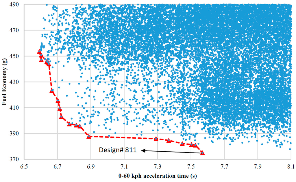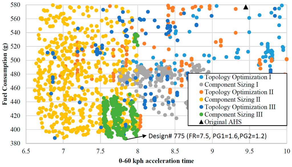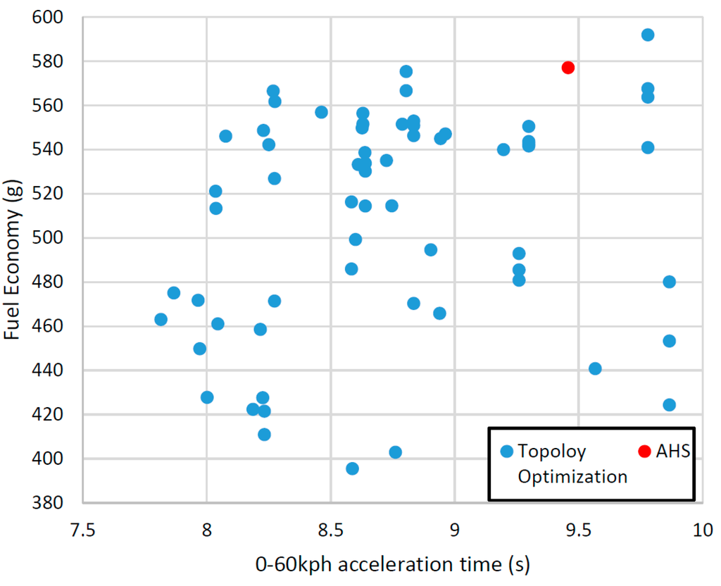 Figure 4 shows the topology optimization results of this plug-in hybrid bus, in which the red point shows the performance of the original benchmark plug-in hybrid bus and blue points are survived designs whose 0–60 kph acceleration is less than 10 s. The fuel consumption in the figure refers to the total fuel consumption calculated through a near-optimal control strategy, called PEARS, under the Manhattan driving cycle. A number of designs show significant improvement on both fuel economy and launching performance. The design with the best fuel economy consumes 395 g diesel for the cycle, nearly 31.5% better than the original AHS design. Up to this point, we only explored topology optimization. Component sizes can be manipulated for even better results but this design DoF has not been explored.
