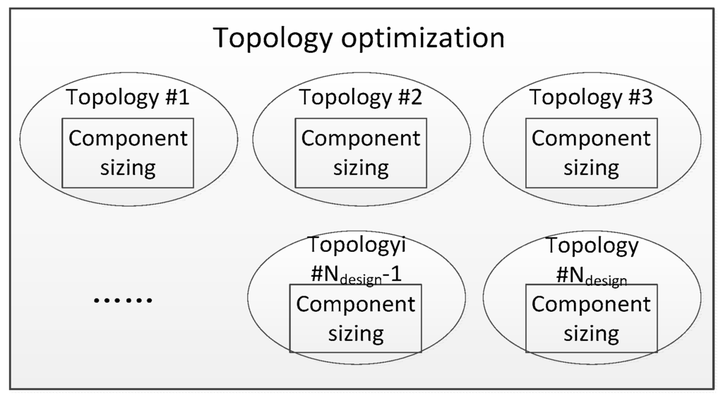 The second approach is called iterative optimization, where the topology optimization and component sizing is executed sequentially and iteratively until convergence. Its process is described in Figure 7.