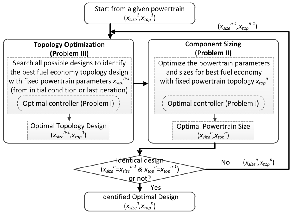 As shown in Figure 7, the loop starts from any given powertrain (xsize, xtop) that the powertrain parameters, component sizes and powertrain topology are all known, e.g., the hybrid bus as shown in Table 1, and the powertrain design from the last iteration (xsizen−1, xtopn−1). In the first step of each iteration, the powertrain topology is optimized with powertrain parameters xsizen−1. In the second step, the optimal powertrain parameters of the optimal topology design derived in the first step are identified by solving Problem II. Afterwards in the third step, the identified powertrain topology with optimal parameters in the second step (xsizen−1, xtopn−1) is compared with the powertrain at the beginning of this iteration (xsizen, xtopn). If the powertrains are the same, referring to identical powertrain topology and parameters, we denote it as the optimal topology and the optimal sizing parameters. If not, the identified powertrain (xsizen, xtopn) requires the topology optimization and component sizing to sequentially check its optimality by comparing the powertrains at the beginning and end of each iteration. The iteration stops when the solution converges. At the end, a new hybrid design with both optimized topology and component sizes is identified.