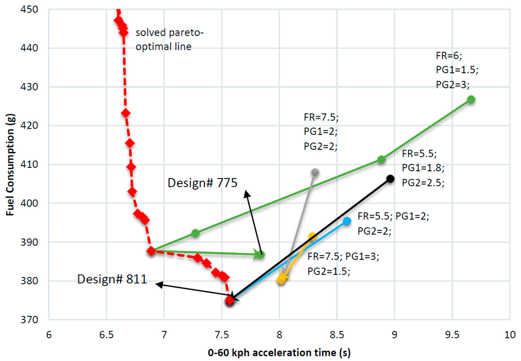 Figure 8 shows the results of nested optimization, where the red triangles form the Pareto front and the X and Y axes stand for the acceleration and fuel economy performance, respectively. Design number refers to a specific design labeled before the optimization. Compared with the original AHS hybrid powertrain, Design 811 has 35.0% and 19.7% improvement on fuel economy and acceleration performance. In addition, we listed the results with only component sizing optimization and topology optimization in Table 2. It can be seen that the design with both component sizing and topology optimized achieves greater improvement than designs when only the topology or component sizing is optimized. Meanwhile, designs obtained with topology optimization perform better than the designs with only component sizing optimization. In other words, topology optimization is a more effective design exploration than tuning component sizes.