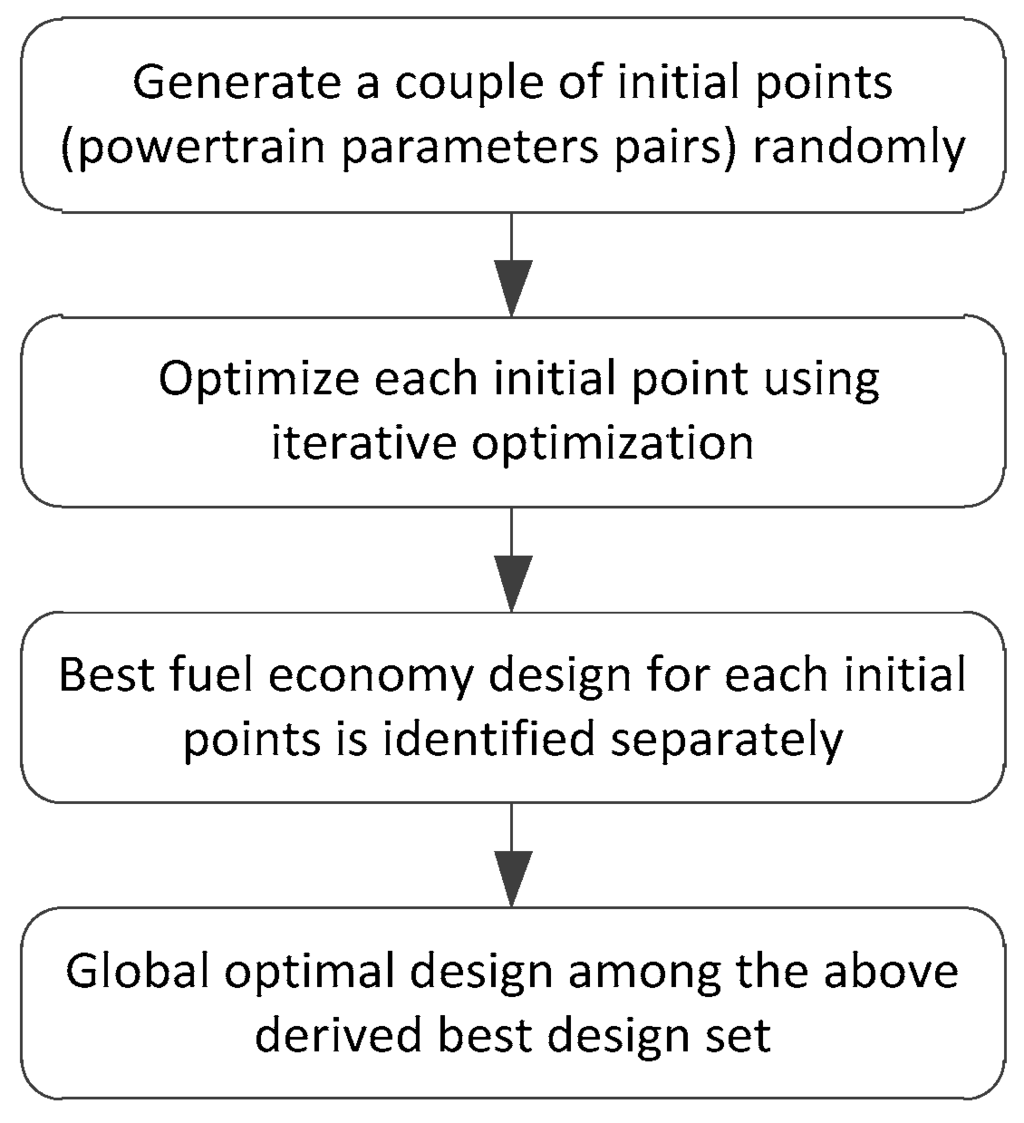 To overcome the sensitivity problem of the iterative optimization, a method, called enhanced iterative optimization is proposed in this part. The process of this method is presented in Figure 11. The optimization starts from a couple of random initial points. For each point, we can identify the best fuel economy design using the iterative optimization. Then, we search the design with minimum fuel consumption among the group of identified designs. In this way, the impact of the initial conditions on the final results can be reduced, while the computational efficiency is still much better than the nested optimization. In summary, Table 4 shows the performance comparison between the three approaches proposed in this paper, where mi represents the number of initial conditions used for computation. Enhanced iterative optimization indicates better convergence performance than iterative optimization and is more efficient than nested optimization.