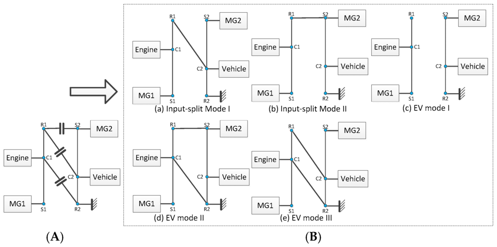 In recent years, a large number of power-split HEV powertrains were patented by original equipment manufacturers and engineers [29,30]; however, many more remain unexplored. There are two ways to generate new multi-mode power-split HEV powertrain designs: by changing the locations of the four powertrain components (engine, two MGs, and the driveline), which results in different combinations. In this paper, represents k-permutations of n. The second approach adds clutches between two PG nodes, or between a PG node and the ground. The total number of possible clutches is [27]: