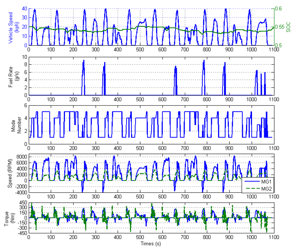 where and are the rotational speeds of the powertrain components at current time step and next step. β1, β2, β3 are the weighting factors to be tuned; the third term in the cost function is used to force the final battery state of charge SOCfinal back to its initial value SOCdesired; α is a large penalty factor to form an equality constraint of the final SOC. In addition, the torque and speed of the powertrain components are restricted by their operating constraints. The available modes Modeavailable for each specific design are different and dependent on the dynamics.
