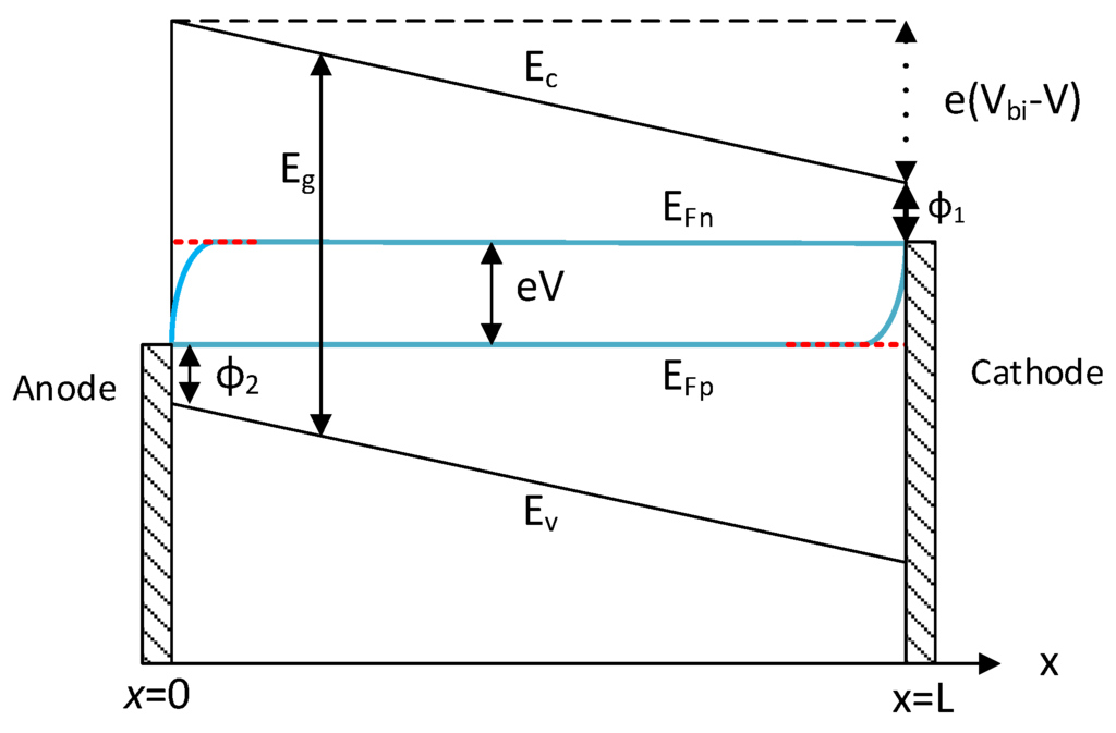It is obvious from Figure 1 that the quasi-Fermi levels for both electrons (EFn) and holes (EFp) coincide with each other at the contacts, yet in most part of the blend thickness the difference remains the same, i.e., EFn – EFp ≈ eV. For simplicity, if we consider EFn – EFp ≈ eV throughout the active layer, then the electron and hole profiles can be simplified as: