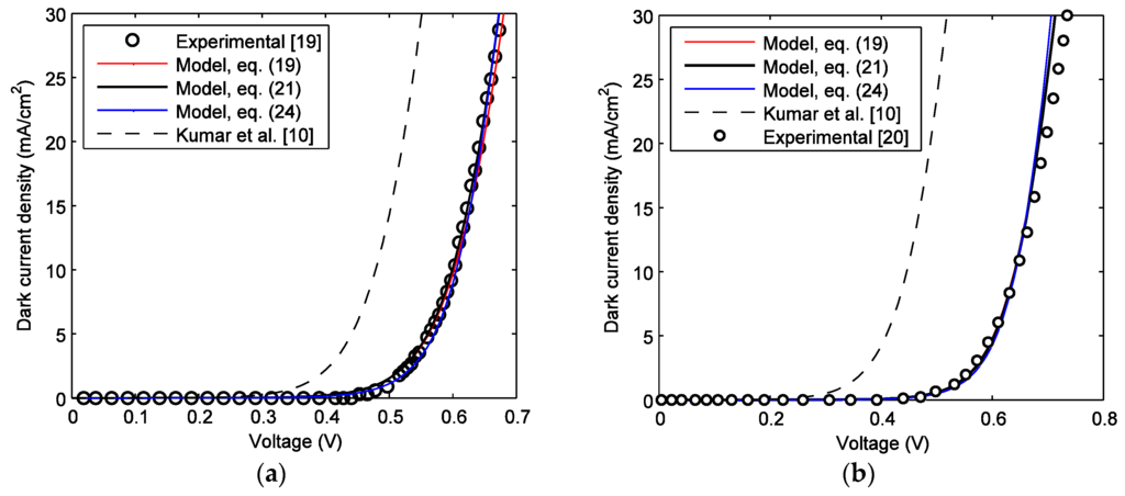 Dark current-voltage characteristics of P3HT:PCBM solar cells. (a) The experimental data are extracted from Reference []; and (b) The experimental data are extracted from Reference [].