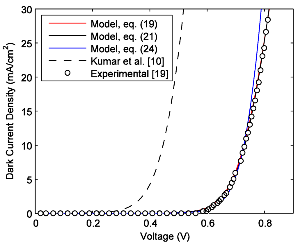 The dark current versus voltage behavior has a significant effect on the overall current-voltage characteristics of the cell. Though the common diode equation has been used for the dark current, its validity in BHJ solar cells has not yet been justified []. Kumar et al. [] proposed an analytical expression for the dark current considering carrier drift and diffusion across the active layer. Since there exists quasi Fermi levels all over the active layer, the recombination current should be the dominant dark current mechanism in BHJ solar cells.