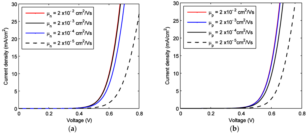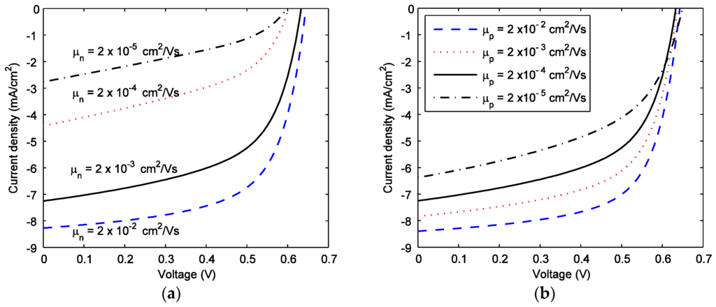 Theoretical current-voltage characteristics of P3HT:PCBM solar cells for (a) varying electron mobility with µp = 2 × 10−4 cm2/Vs and (b) varying hole mobility with µn = 2 × 10−3 cm2/Vs. Carrier lifetimes are: τn = τp = 20 μs.
