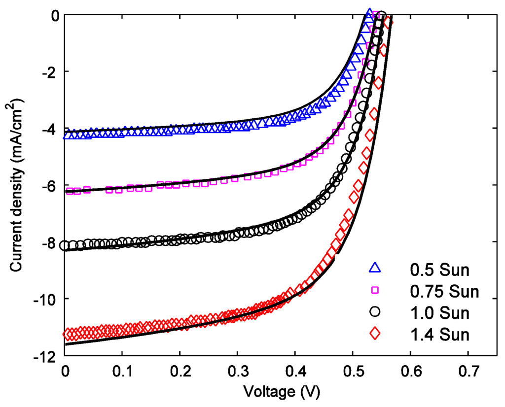 Current-voltage characteristics of a P3HT:PCBM solar cell at different sun intensities. The symbols represent experimental data and solid lines represent the model fit to the experimental data.
