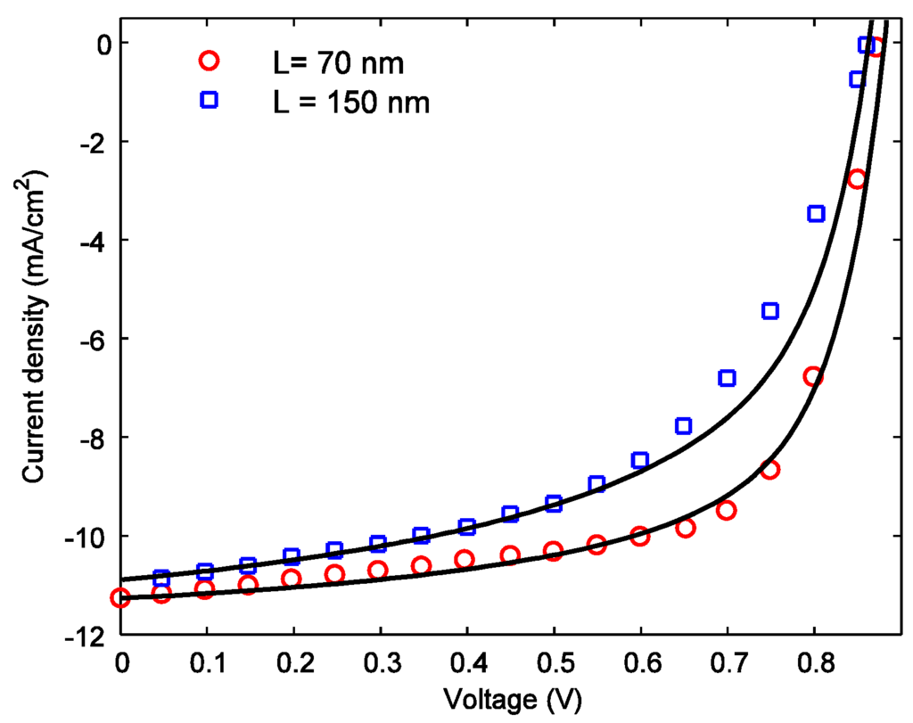 Figure 6 shows the effects of active layer thickness on J-V characteristics of PCDTBT:PC71BM solar cells. The symbols and solid lines represent the experimental results [] and model fit, respectively. The cell performance, particularly the fill factor, deteriorates with increasing the active layer thickness from 70 to 150 nm. Low carrier mobility in PCDTBT are responsible for lower charge collection efficiency in thicker devices. Therefore, the active layer thickness is usually kept around 70–80 nm. The bandgap and dielectric constant (εr) of PCDTBT:PCBM blend are 1.2 eV and 3.8. The dissociation efficiencies at maximum power points are 99% and 98.5% for W = 70 nm and W = 150 nm, respectively, which indicates that the dissociation efficiency in PCDTBT:PCBM blend is much higher as compared to P3HT:PCBM blend. The other fitting parameters in Figure 6 are; μn = 5 × 10−5 cm2/Vs, μp = 6 ×10−5 cm2/Vs, τn = 13 μs, τp = 25 μs, r0 = 1.8 nm, and Rs = 0.3 and 1 Ω·cm2 for W = 70 and 150 nm, respectively. The fill factor decreases from 67.8% to 55% by increasing the active layer thickness from 70 nm to 150 nm.