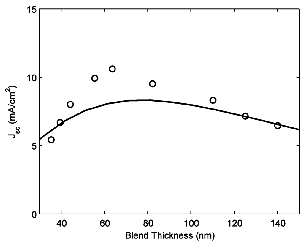 The effect of blend thickness (L) on short circuit current density (Jsc) for a P3HT: PCBM based BHJ solar cell is shown in Figure 7. The symbols and solid lines represent the experimental data and the model fit to the experimental results, respectively. The experimental data are extracted from Figure 6 of Reference []. The short circuit current should increase with increasing the blend thickness because the thicker layer absorbs more photons (i.e., higher quantum efficiency). On the other hand, the charge collection efficiency decreases with increasing the thickness, which results in lower short circuit current. Thus, there exists an optimum thickness that maximizes the short circuit current as shown in Figure 7. The fitting parameters in Figure 7 are; μn = 10−3 cm2/Vs, μp = 2 × 10−4 cm2/Vs, τn = 0.1 μs, τp = 0.2 μs, R = 0.02, and Rs = 0.5 Ω·cm2.