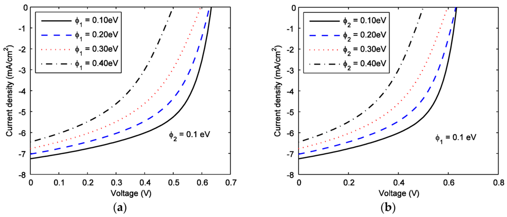 The injection barrier heights have a profound effect on the current-voltage characteristics of organic solar cells. The effects of the injection barriers on the current-voltage characteristics of P3HT:PCBM based BHJ solar cells are shown in Figure 8. An increase of the electron (hole) injection barrier is equivalent to an increase (decrease) of the cathode (anode) work functions. The built-in potential and electric field decrease with increasing the injection barriers, which reduces the charge collection. Therefore, the short circuit current decreases almost linearly with increasing the barrier heights. The open circuit voltage slighty decreases with increasing the barrier heights for low barrier heights (, < 0.3 eV) and it is equal to the built-in potential for the higher barriers (, ≥ 0.4 eV). The parameters used in Figure 8 are; μn = 2 × 10−3 cm2/Vs, μp = 2 × 10−4 cm2/Vs, τn = τp = 20 μs, L = 180 nm, R = 0, and Rs = 0.3 Ω·cm2.