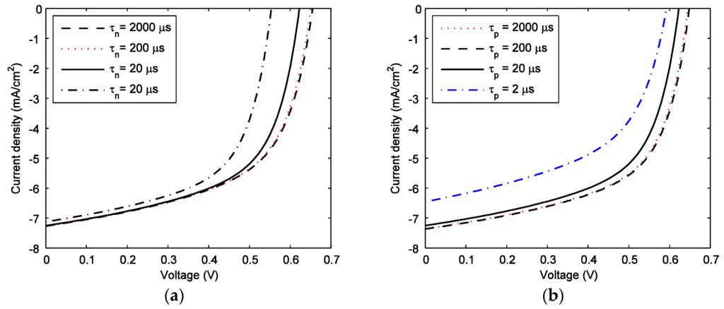 Most of the incident photons are absorbed near the front contact (x = 0) and thus the photogenerated free electrons have to travel relatively longer distance than the photogenerated holes. Therefore, the efficiency of BHJ solar cells should be more prone to the electron lifetime than to the hole lifetime. The effects of τn and τp on the J-V characteristics of a 230 nm thick P3HT:PCBM solar cell are shown in Figure 10a,b, respectively. All other parameters in Figure 10 are the same as in Figure 8. The open circuit voltage and short circuit current decrease with decreasing both the electron and hole lifetimes. However, the open circuit voltage is more prone to the electron lifetime whereas the short circuit current is more prone to the hole lifetime. The enhancement of the dark current with decreasing carrier lifetimes reduces the open circuit voltage.