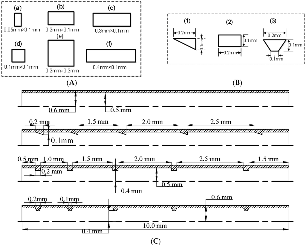 Schematic diagram of physical model: (A) the sizes of single rectangular protuberances; (B) slight protuberance structures of different shape; (C) the case of five protuberances for three different shapes.
