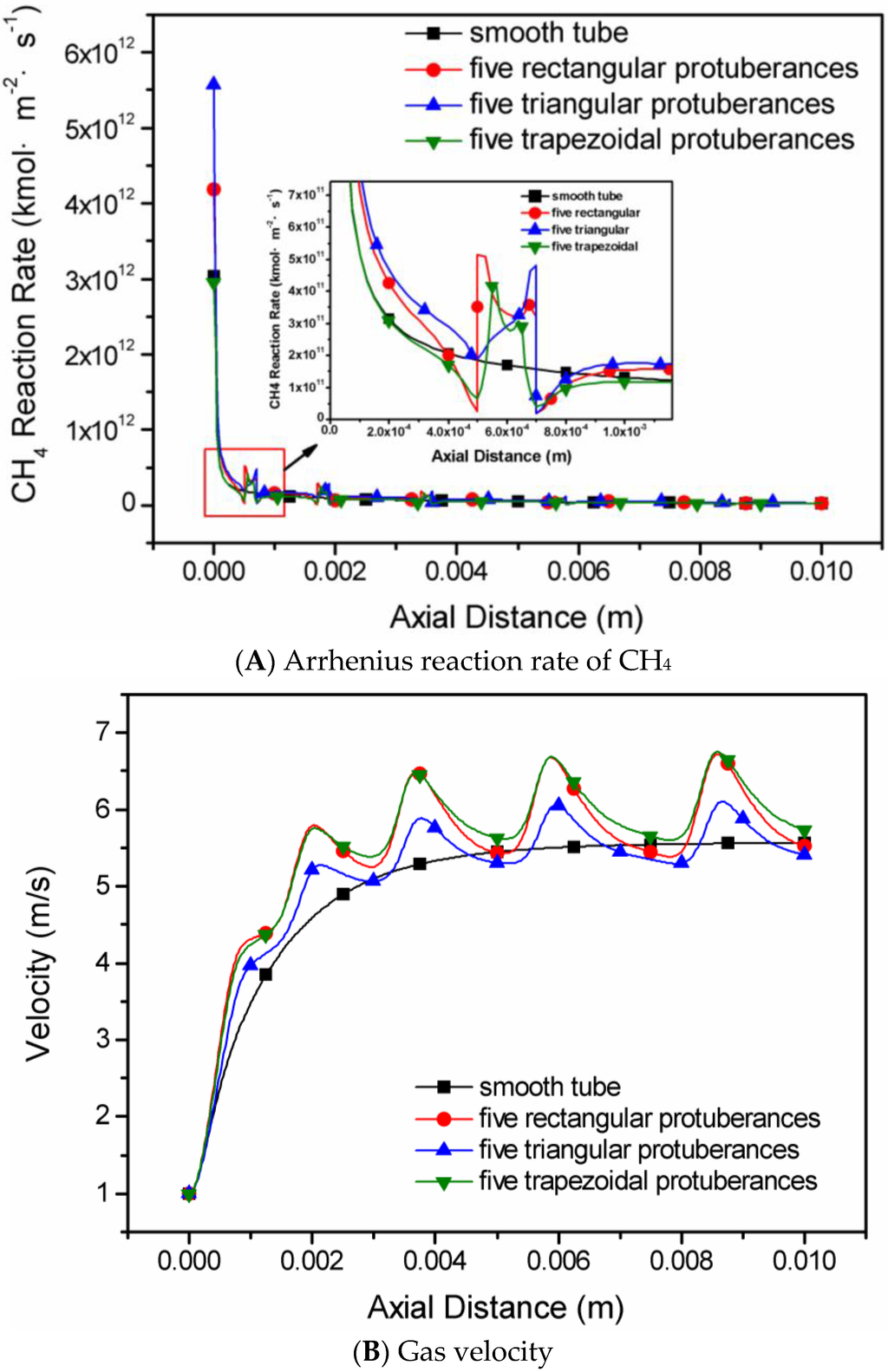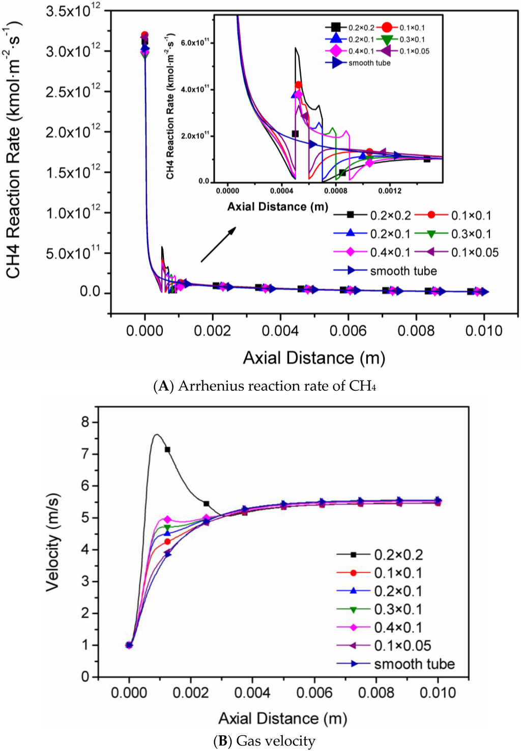Figure 2A indicates that the reaction occurs immediately as the mixture gas enters the micro-tube. Because the mixing and collision among the mixture gas is severe, the Arrhenius reaction rate of CH4 is high and then tends to stabilize at 1 mm away from the entrance; Moreover, the Arrhenius reaction rate of CH4 is approximately the same except that in the vicinity of the slight protuberance surfaces. All of the CH4 reaction rates in non-smooth tubes are higher than that in smooth tubes, as shown in the enlarged drawing of Figure 2A. The slight-protuberances on the inner walls promote the heat transfer and radical diffusion between the flow mixtures and the inner walls. As for the extremely fast reactions in micro-reactors, residence time is an important parameter for heat transfer and radical diffusion. In fact, adding rectangular protuberance on the inner wall reduces the radical distance in the micro-tube, leading to a shorter residence time, CH4 diffuses more quickly from gas phase to the catalyst surface in the smaller channel under this circumstance, thus the reaction rate of CH4 significantly increases in the vicinity of the protuberance surface.