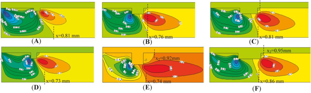 Contours of r-direction velocity (m/s) near the protuberance surfaces in the micro-tubes, the dimensions of protuberances are (A) 0.05 × 0.1; (B) 0.2 × 0.1; (C) 0.3 × 0.1; (D) 0.1 × 0.1; (E) 0.2 × 0.2; (F) 0.4 × 0.1, units (mm × mm).