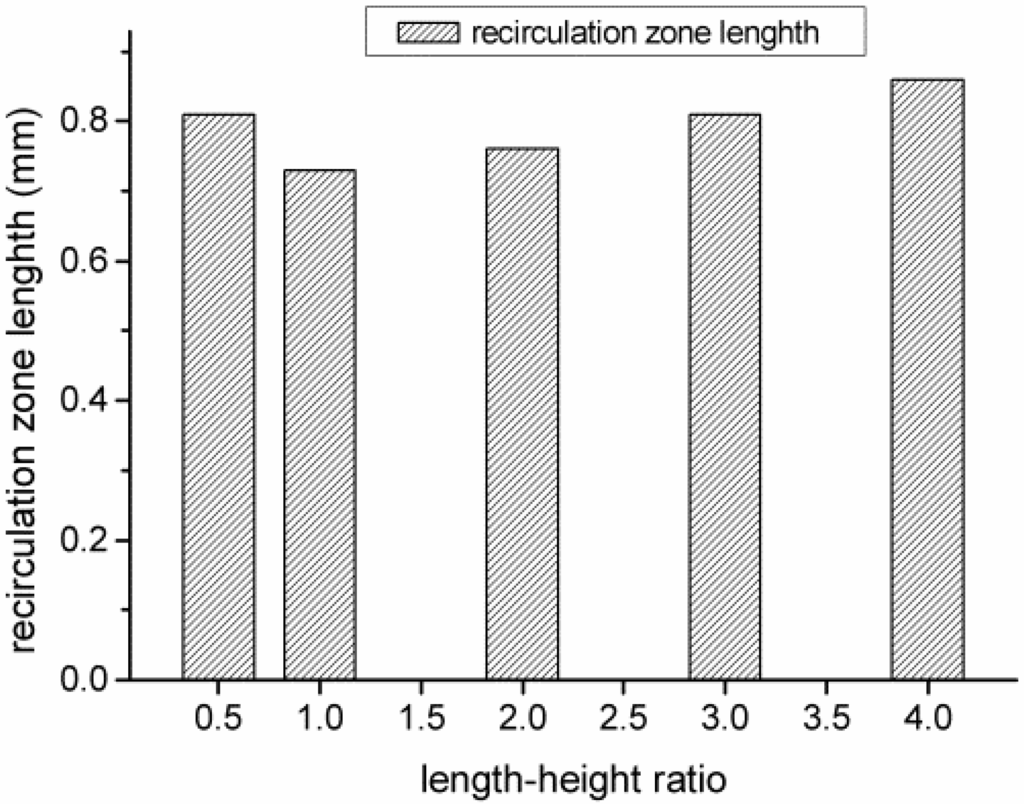 Figure 2B shows that in the vicinity of slight protuberances, the centerline velocity along the axis firstly increases and then decreases quickly, and a recirculation zone which can prolong the inflow residence time and enhance the contact between radicals and catalyst will be formed. From Figure 3 and Figure 4, the size of these recirculation zones can be seen clearly, and the area of the low velocity zone increases with the length-height ratio of the protuberances, thus, the fuel has sufficient time to burn.