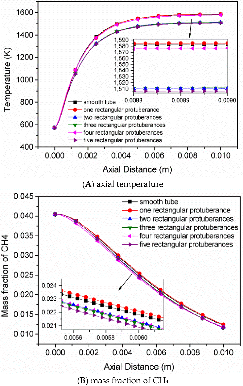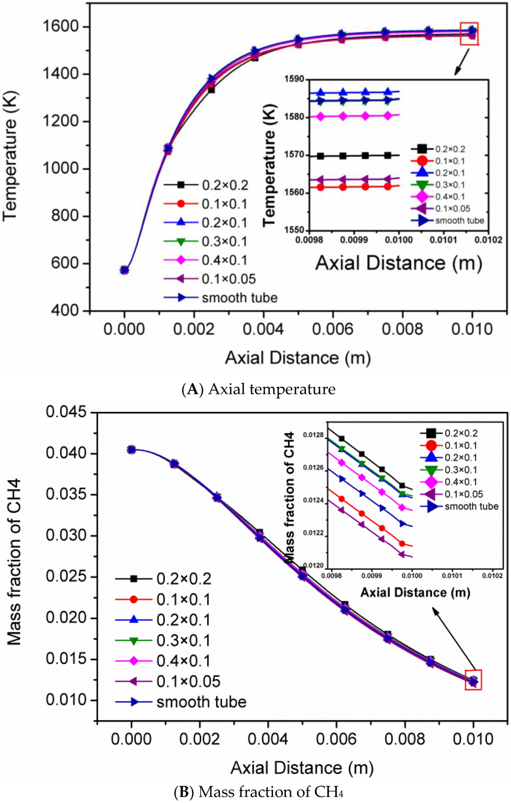 Furthermore, the r (radius)-direction velocity and the recirculation zone increase with the increase of protuberance height and area, which is in accordance with the tendency of the methane reaction rate. Zhai et al. [54] found that most of the energy released from the combustion was used to heat the gas when the reaction took place with a short residence time, therefore, the outlet temperature could rise greatly. As depicted in Figure 5A, the sizes of rectangular protuberances have little influence on the centerline temperature. The maximum outlet temperature difference (in Table 1) is about 25 K among all simulated reactors, which indicates that a single rectangular protuberance has little effect on the overall residence time. It is inferred that the slight protuberance and cavities can strengthen convective heat transfer so that the temperature distribution is more uniform. Figure 5B shows the mass fraction of methane in different micro-tubes, which indicates that effect of different protuberance sizes on methane conversion rate is slight. Table 2 shows that the methane conversion rates are 87.48%–87.88% for the different tubes.
