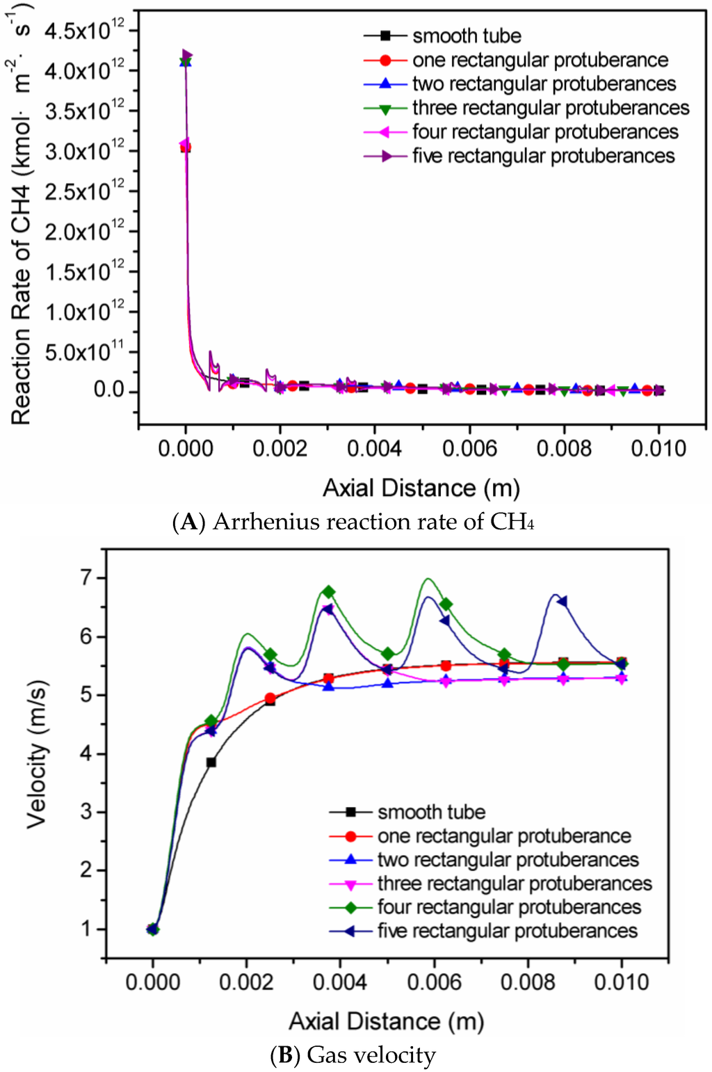 The addition of slight protuberances on the inner wall leads to an increment of the axial surface area, but a decrease of the longitudinal distance in the micro-tube. Figure 6A illustrates that the trends of the effect on methane conversion rate caused by 1–5 rectangle protuberances are almost the same. After 1 mm from the entrance, the influence of the number of protuberances on the Arrhenius reaction rate of CH4 decreases as the mixtures flow towards the exit. Researchers have demonstrated that the residence time can be reduced by augmenting the gas velocity or increasing the operation pressure while keeping the channel size constant [55]. Figure 6B shows the influence of protuberance number on the gas velocity. It indicates that the gas velocity has increased to 4.5–7.0 m/s in the vicinity of the protuberances, while the velocity of a smooth tube gradually increases from 1 to 3.5 m/s, at the inlet and 2 mm away from the entrance, respectively, then remains stable at 5.5 m/s after 4 mm from the entrance. The maximum outlet velocity difference between a non-smooth tube and a smooth tube is about 1.2 m/s.