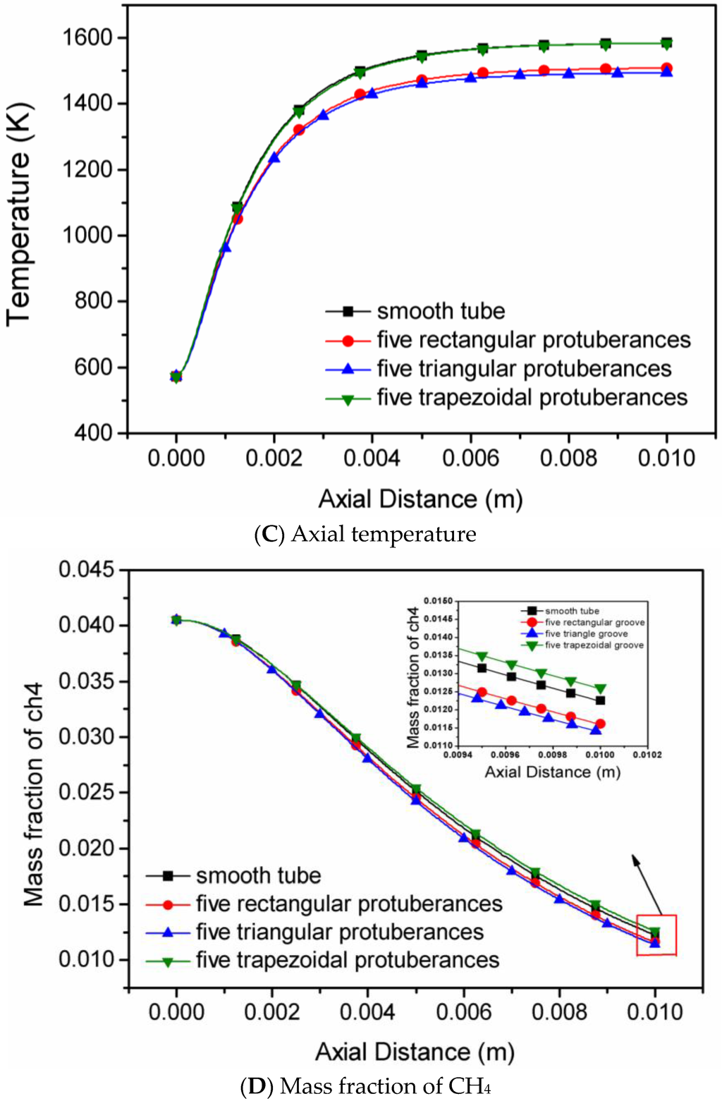 When the reaction occurs with a short residence time, most of the heat released from the combustion is used to heat the mixture gas, which leads to the rise of the outlet temperature. However, the participation of water steam in the inlet gas and the production of water could impact the outlet temperature, as with the increasing gas temperature, the specific heat of H2O is reduced under constant pressure, thus, outlet temperature may also be reduced [55]. With the increase of temperature along the axial direction the mass fraction of CH4 decreases gradually, as displayed in Figure 9D. It is noted that the mass fraction of CH4 at the outlet, is the maximum for the five trapezoidal protuberances and the minimum for the five triangular protuberances, which is in accordance with the value of the outlet temperature. As for the variation of methane conversion, the conversion rate is the highest in the micro-tube with five triangular protuberances, while the lowest one is in the micro-tube with five trapezoidal protuberances. Therefore, in all simulated methane/moist air catalytic combustion conditions, the micro-tube with five triangular protuberances has the peak efficiency and is recommended for high efficiency reactors.